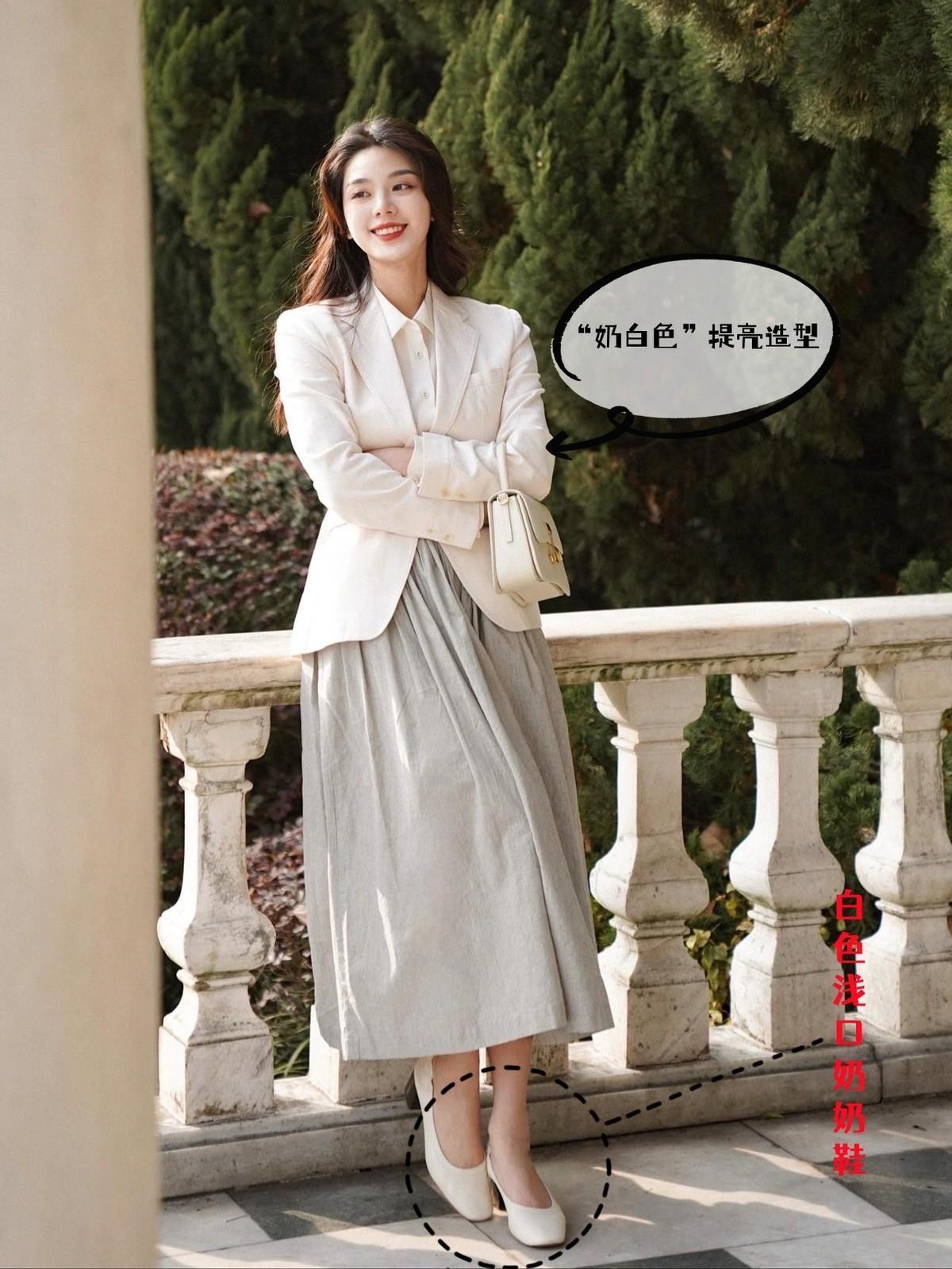 夏季前卫穿搭指南:一件衬衫大略西服搭配上半身裙和乐福鞋,高档优雅显年青